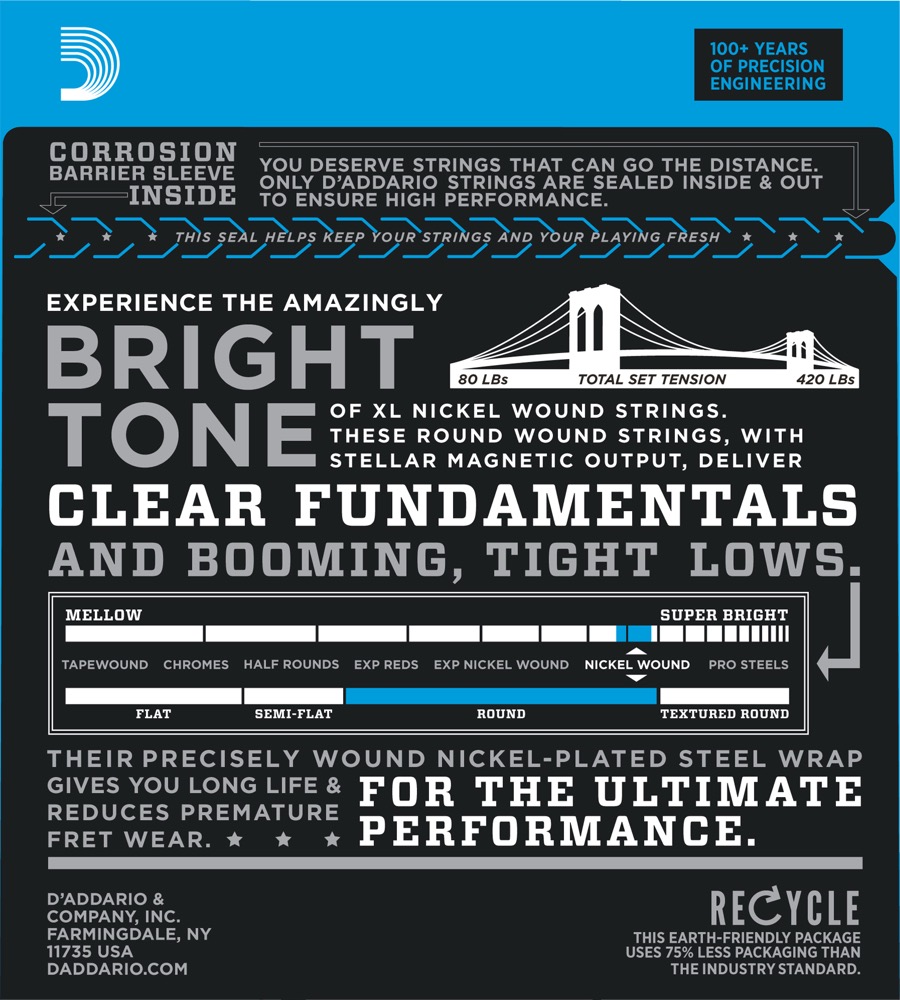 D’addarios mest populära elbassträngar. Nickelpläterat stål ger en stark magnetisk utgångssignal och en komfortabel jämn spelyta som reducerar för tidig utnötning av greppbrädesbanden.