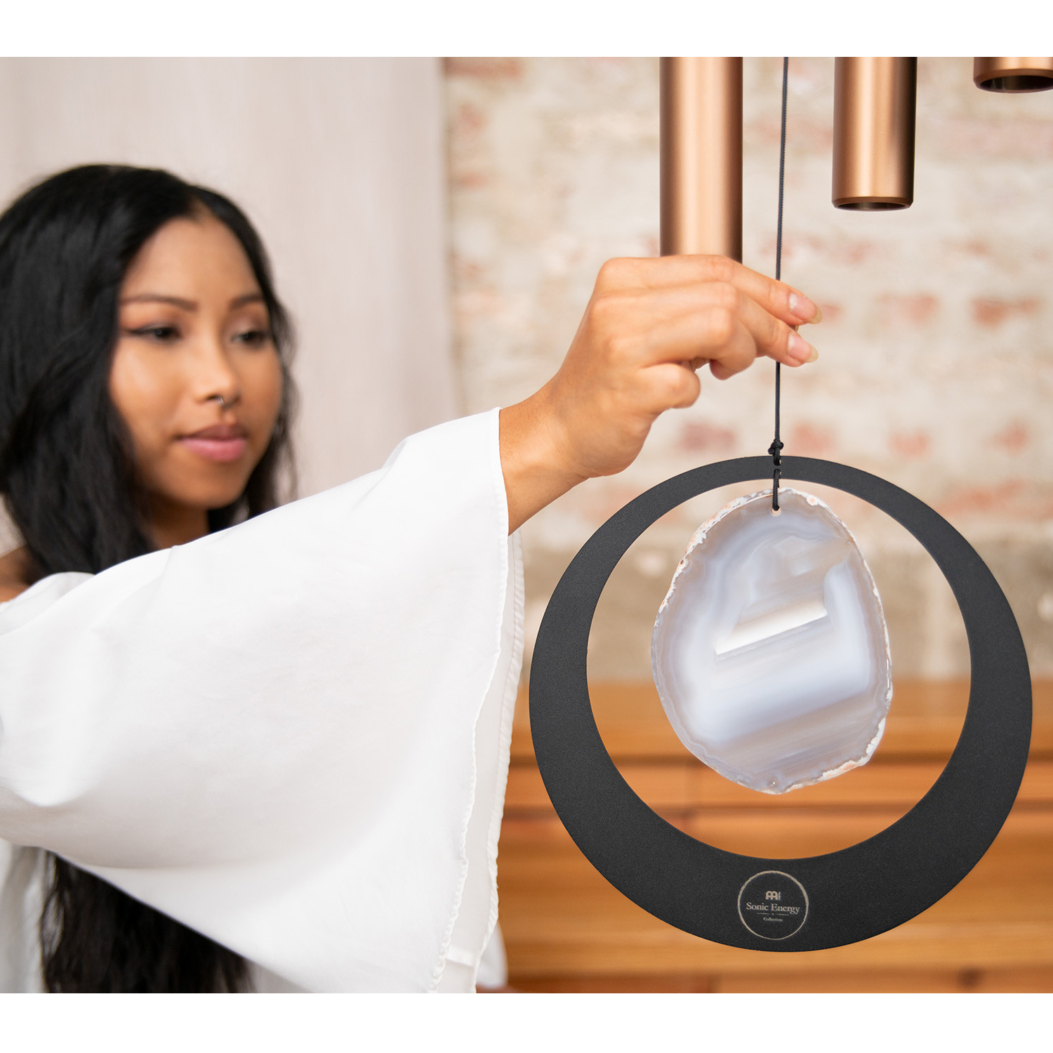 Meinl Sonic Energy Agat Meditation Chimes är bra för meditation, avslappning, terapiapplikationer eller till och med för att dekorera din trädgård och ditt hem. Deras magiska, djupa ljud fyller hela omgivningen och inbjuder dig att drömma. Dessa klockspel kännetecknas av en särskilt god resonans och lång efterklang. De är stämda utifrån A4/a' 432 Hz. Njut av det klara och glada ljudet. En dekorativ agatsten längst ner på snöret fullbordar dessa vackra klockspel. Dess helande energier är avsedda att hjälpa dig att uppnå lugn och ro, för att ta bort blockeringarna i din aura som hindrar dig från att se svaren. Eftersom det är en naturlig agatsten kan formen och färgen variera något. Fäst meditationsklockan på toppen av aluminiumringen.