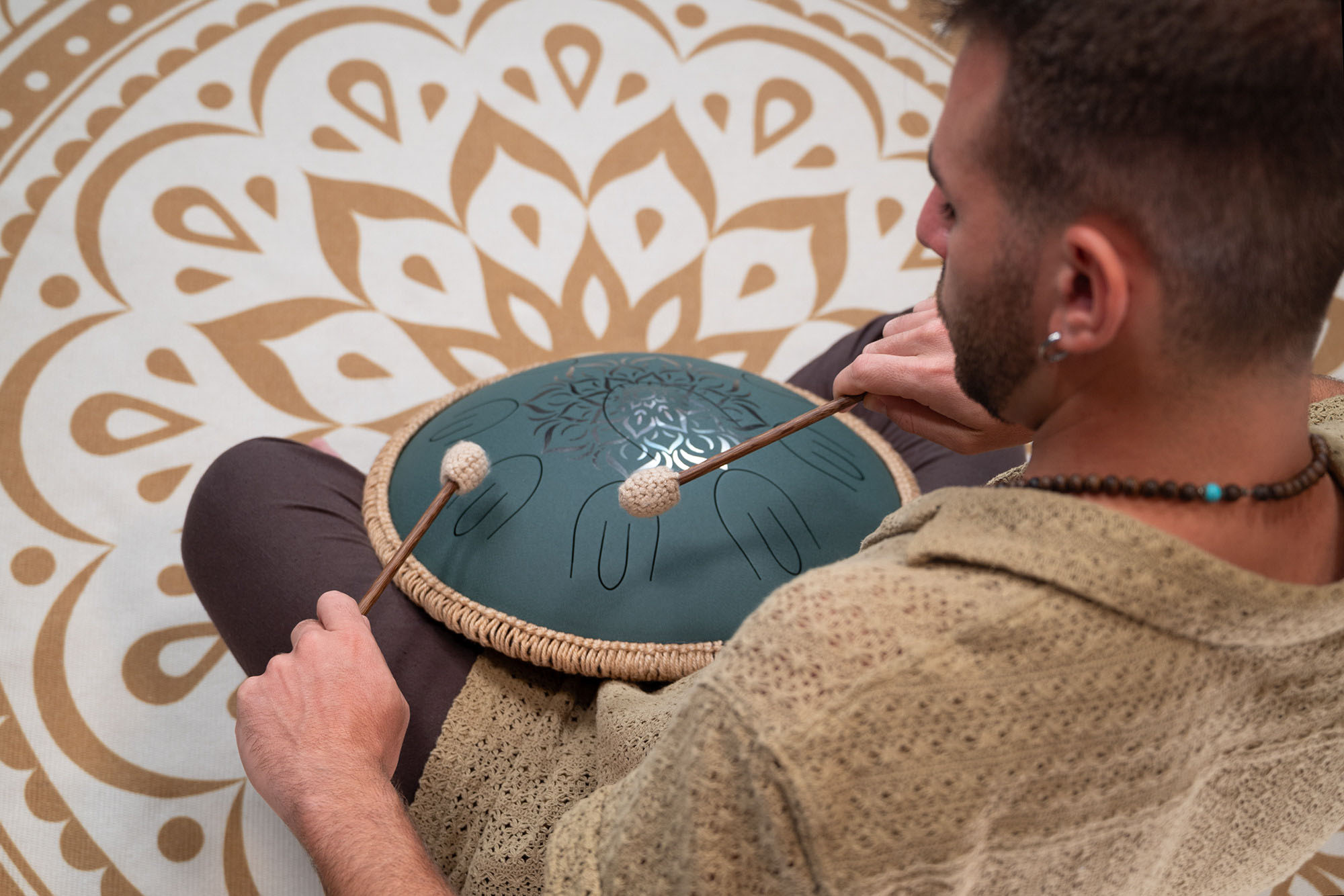 Det finns också tre silikonfötter längst ner för att hindra trumman från att glida. Du kan spela Octave Steel Tongue Drum med klubbor eller med fingrarna. Lägg den bara på en slät yta eller i knät för att börja spela. Trumman levereras med två träklubbor med gummihuvud och en fin bärväska med dragkedja och handtag.