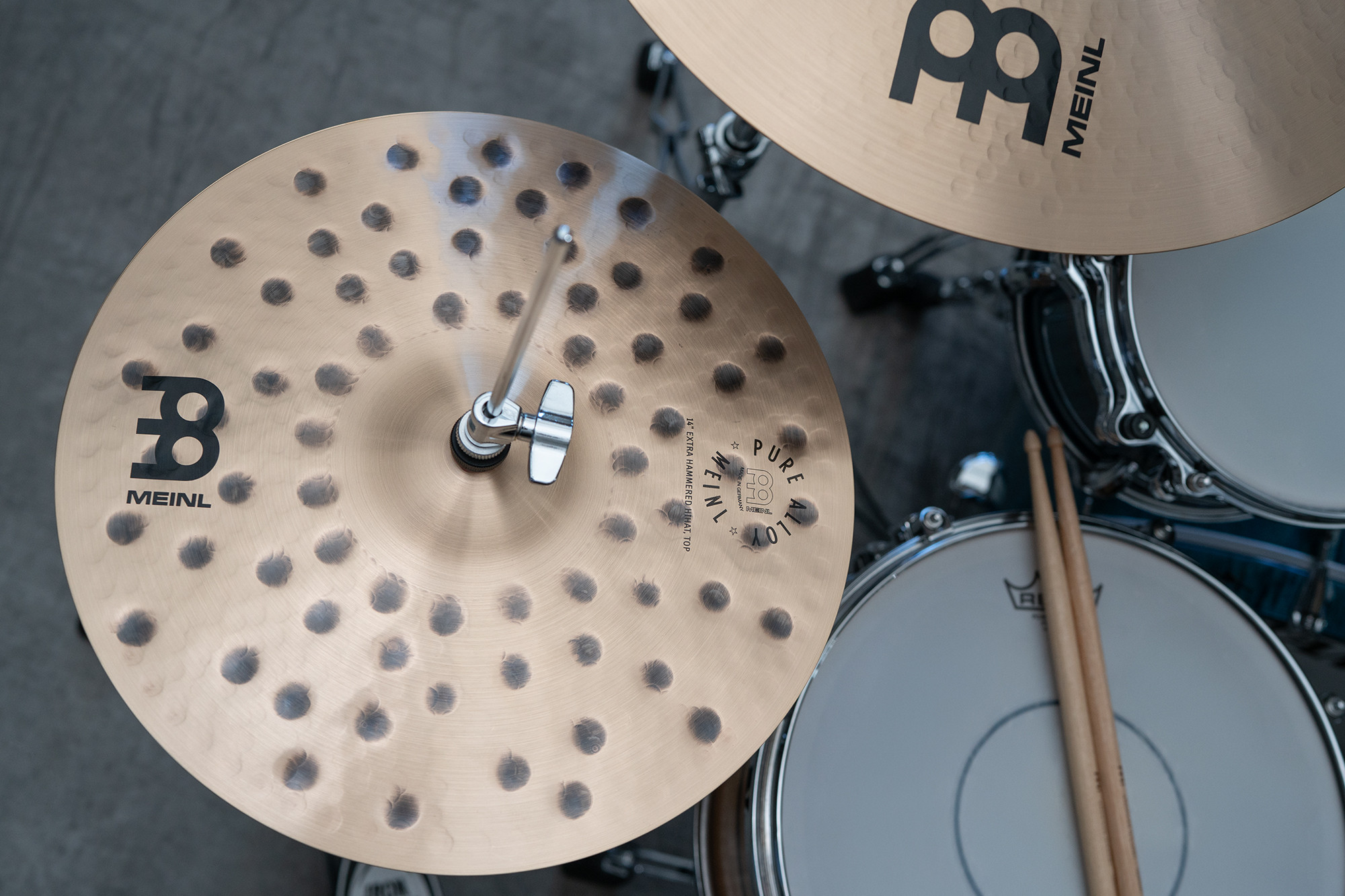 Meinl Pure Alloy 14" Extra Hammered Hi-hat hi-hats har dynamisk bredd från staccato med tydlig attack till fylligt halvöppet sound med hög energi.