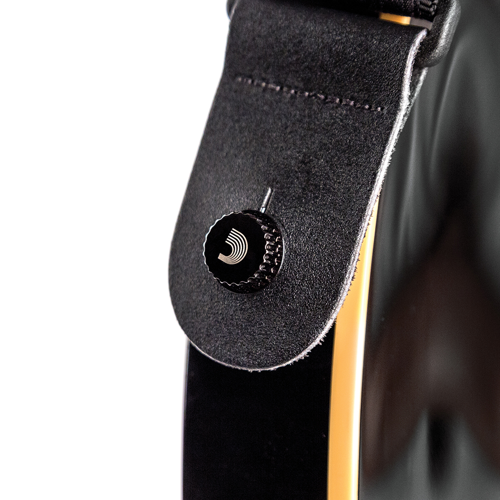 D'Addarios universala låsmekanism ser till att axelbandet inte lossnar från din gitarr. De två delarna monteras i axelbandet respektive på gitarren. Axelbandet snäpper sedan snabbt och säkert fast i gitarren när du tar på dig gitarren. Lika enkelt tar du av gitarren. Designad av Ned Steinberger.