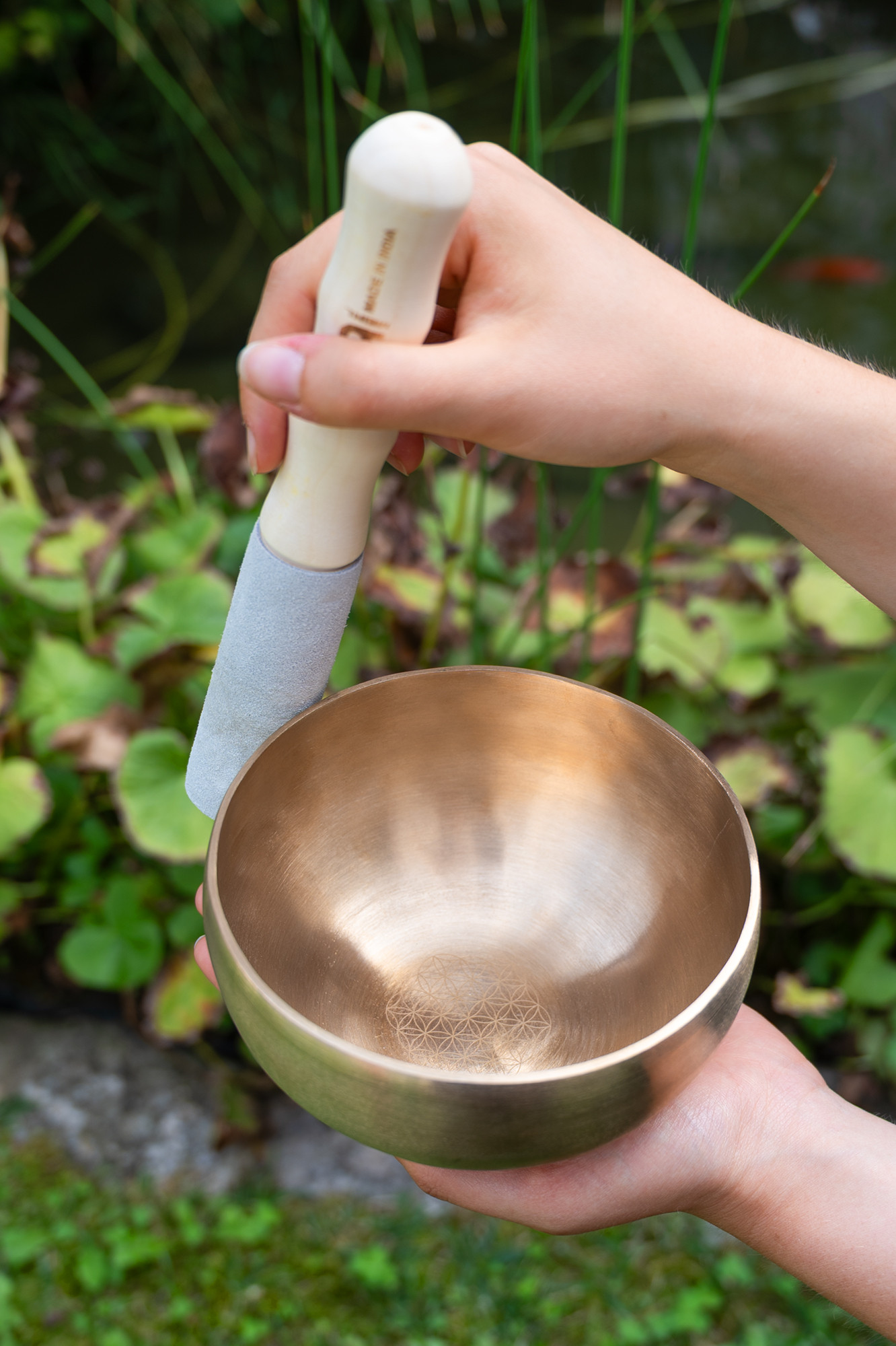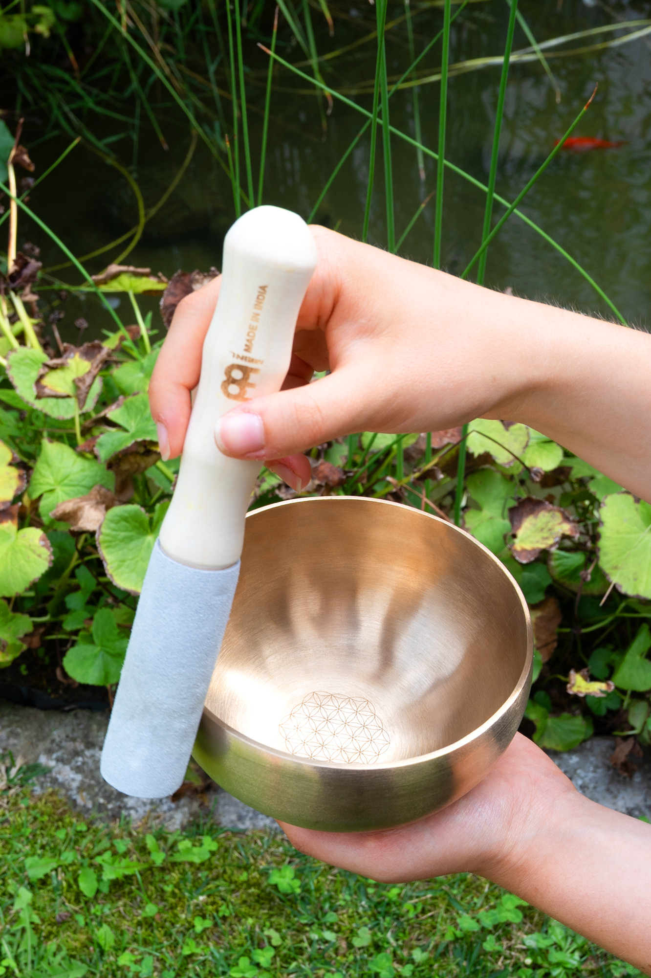 Detta Flower of Life Singing Bowl Set, som innehåller en 600g sångskål, har en elegant Livets blomma-gravyr som symboliserar harmoni, energi och förbindelse. Den kan spelas individuellt eller kombineras med andra sångskålar för att skapa ett lugnande och immersivt ljudlandskap. Skålen levereras med ett matchande överdrag, en mjuk bovetedyna för stabil placering och en resonant leather mallet (SB-RM-LE) designad för att framhäva rika övertoner och långvarig sustain. Oavsett om det är för personligt bruk, yogastudior eller terapirum, bjuder denna sångskål in lugn, fokus och balans i varje rum.