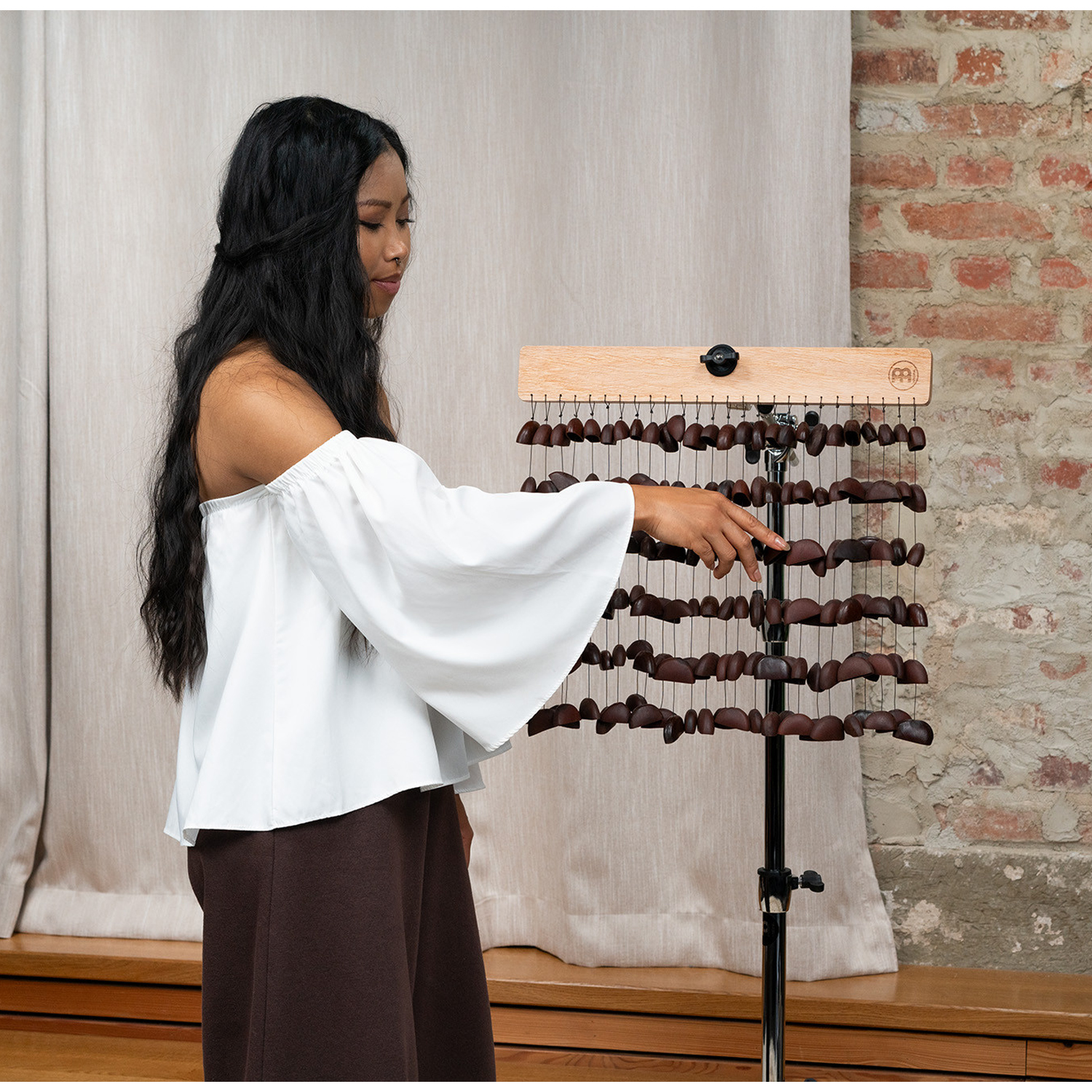 Bendo seed nutshells/frönötskal, fästa på en solid bit mahogny, skapar ett unikt, mångsidigt instrument. Meinl Sonic Energy Bendo Chimes spelas som typiska chimes, men erbjuder en helt annan ljudvariation. Dess klara och skarpa ljud sticker ut från massan och är perfekt för avslappnande ljudbad och musikaliska sessioner.